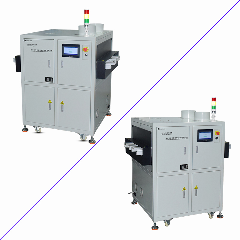 2、設備提供聯機模式和單機模式可選,聯機模式下,本機通過 SMEMA 通信方式, 跟上位機和下位機進行物料對接并固化,單機模式下,點擊啟動按鈕,UV 機輸送帶及 UVLED 一直工作(UVLED 可以屏蔽),點擊停止按鈕,傳送帶及 UVLED 停止工作。